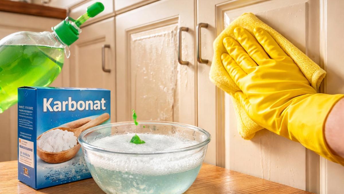 Karbonat yağ tabakasını parçalayarak yüzeyden ayrılmasını sağlarken, bulaşık deterjanı çözülen yağı hapsedip bezle birlikte tamamen uzaklaştırıyor. Böylece dolaplarda matlık bırakan yapışkan kalıntılar kimyasal ürün kullanmadan temizlenmiş oluyor.