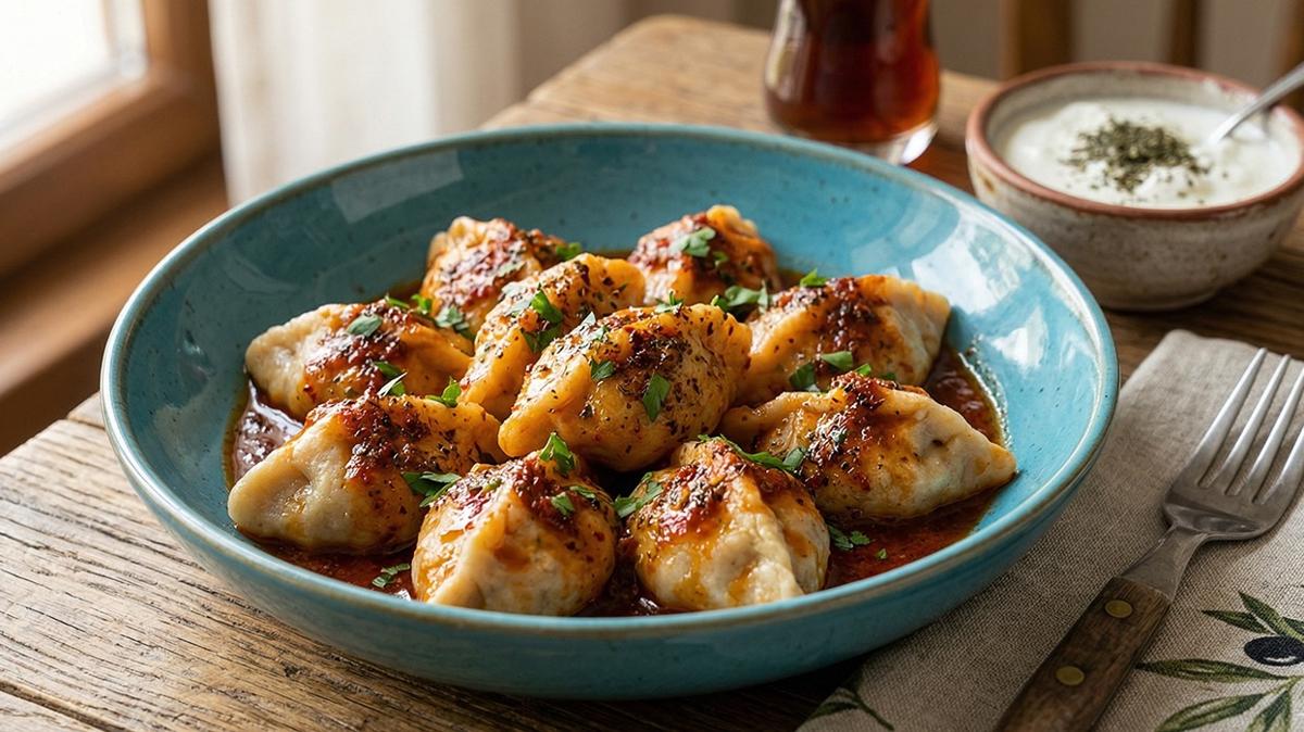 Mantı hamurunun sertliği ile tavuklu pirinç pilavının yumuşak iç dokusunu bir araya getiren bu tarif, servis edildiği anda tüm dikkatleri üzerine çekiyor.